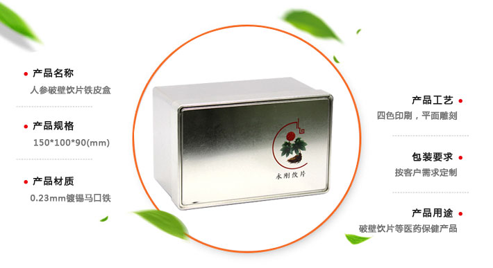 定做人參破壁飲片鐵盒,長(zhǎng)方形三七粉馬口鐵盒,保健品鐵盒包裝廠