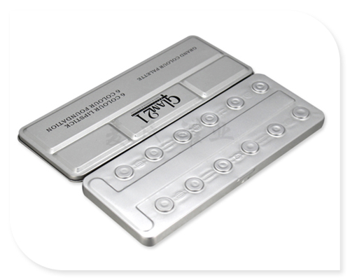 這款12色眼影彩妝鐵盒,是常規(guī)的化妝工具包裝產(chǎn)品,鐵盒風格參照了KR彩妝鐵盒進行設(shè)計。鐵盒依舊為鐵線翻蓋鉸位,蓋面與底部都有激凸工藝處理,而蓋面為提升效果的矩形平雕工藝,而底部為適合十二色規(guī)格的彩妝盤雕刻,而彩妝盤雕刻可根據(jù)客戶的需求進行制作八色、二十四色等。